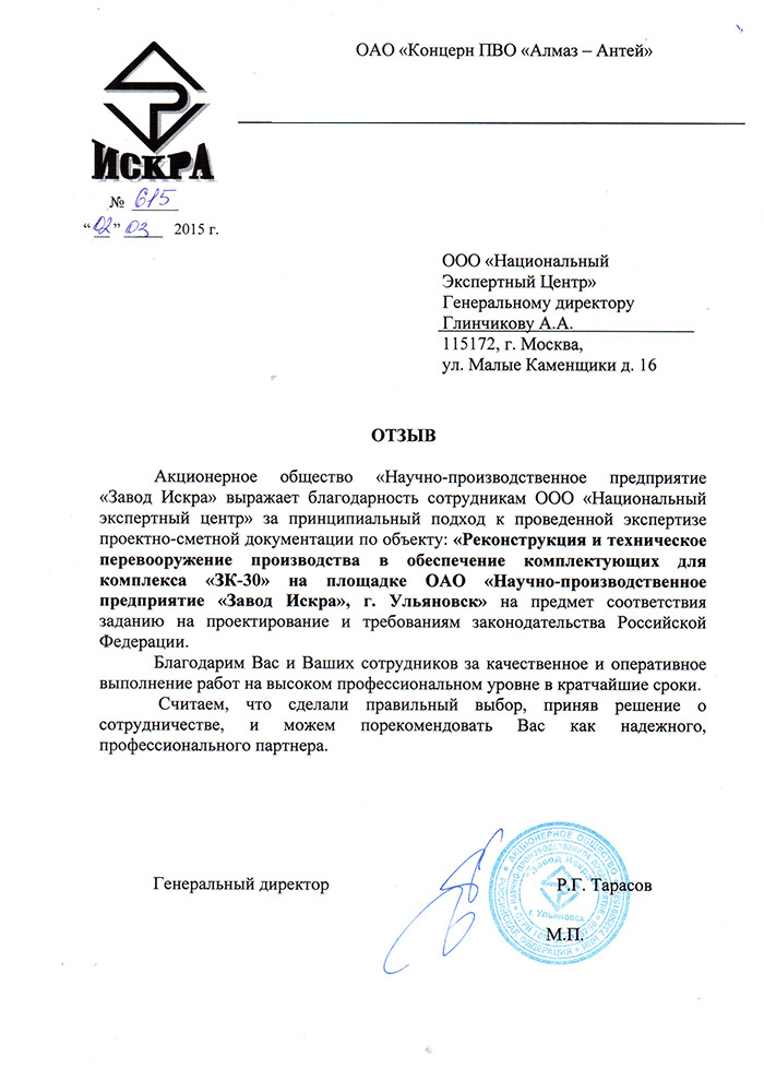 Реконструкция и техническое перевооружение производства в обеспечение комплектующих для комплекса «3К-30» на промплощадке ОАО «Научно-производственное предприятие «Завод «Искра» в г. Ульяновске